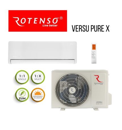Jedinečný, veľmi elegantný dizajn zariadenia si nájde svojich fanúšikov medzi milovníkmi rôznych štýlov. Versu Pure púta pozornosť svojou čistou formou. Originálny tvar odkazuje na dizajn svojich predchodcov z rodiny Versu. Navyše biele a decentné strieborné lemovanie jemných okrajov predného panelu klimatizácie je v súlade s trendmi moderného dizajnu. Jemné 180° kaskádové prúdenie vzduchu, dosiahnuté vďaka horizontálnej lamele otáčajúcej sa okolo vlastnej osi, tichá prevádzka, len 19 dB, a pokročilý systém čistenia vzduchu sú prednosťami tohto mimoriadne efektívneho, celoročného zariadenia s najvyššou triedou energetickej účinnosti chladenia A+++.